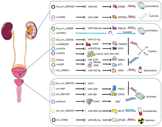 Functional circRNAs and their mechanisms in the development of chemotherapy and radiotherapy resistance in genitourinary. Mostly, circRNAs bind the miRNAs, thus preventing the latter from regulating their mRNA targets. Rarely, circRNAs directly interact with proteins to perform their functions. The blue/red arrow presents the effect on drug sensitivity if the circRNAs are overexpressed. Circ_CCNB2 and hsa_circ_0035483 are identical and share the same color. EMT: epithelial–mesenchymal transition.