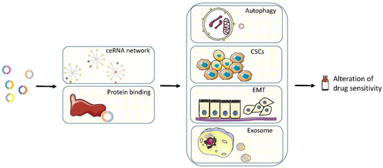 The ceRNA network is a typical example of the post-transcription regulation of gene expression. Transcripts can regulate each other by competing for shared miRNAs. The ceRNA network comprises protein-coding mRNAs as well as non-coding RNAs, including long non-coding RNAs (lncRNAs), circRNAs, and pseudogene RNAs. Via the ceRNA network, non-coding RNAs could contribute to anti-cancer drug resistance [141]. In recent years, the studies on the mechanism of action of circRNA in drug resistance are mostly based on the ceRNA network. As shown in Figure 2, the ceRNA network is still the main approach to drug resistance in genitourinary cancers.
