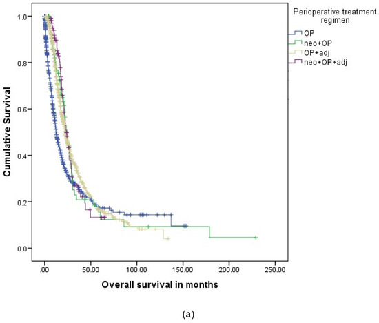 Regarding baseline parameters in the GCRG/ADT registry, the respective perioperative therapy patient cohorts were not well balanced. Patients who underwent OP alone and OP + adj patients were older than neo + OP and neo + OP + adj patients (median 69 and 68 years vs. median 62 and 62 years, p = 0.010). The cohorts of OP alone patients, neo + OP patients, OP + adj and neo + OP + adj patients, as well as neoRCTX + OP and neoCTX + OP patients, were well-balanced for all other baseline parameters, Supplementary Tables S1 and S2.