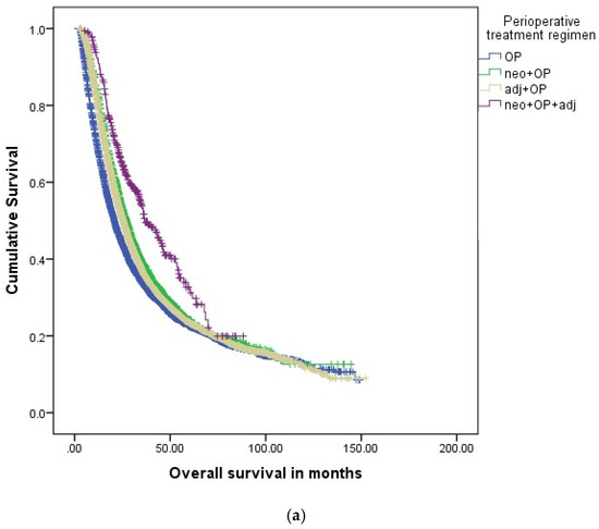 For statistical analysis, IBM SPSS Statistics for Windows, Version 25.0 was used. Continuous and categorical variables were expressed as median/range and absolute/relative frequencies, respectively. To compare age, sex, ECOG performance status, and Charlson-Deyo co-morbidity index between perioperative treatment groups, chi-square testing was performed. To compare T category, N category, and R status between patients with neoadjuvant versus no neoadjuvant therapy, chi-square testing was used as well. For head-to-head comparisons of perioperative treatment regimens, 1:2 or 1:1 propensity score-based matching was performed if baseline parameters (age, sex, co-morbidity index) differed between the groups. Different distributions of age, sex, and co-morbidity indices across treatment groups may introduce bias and impact long-term outcomes, so propensity score-based matching was introduced to create well-balanced groups for comparisons of treatment effects. Median overall survival estimates were determined with the Kaplan–Meier method and Cox proportional hazard model. The significance level was set to p < 0.05 (two-sided). All confidence intervals (CI) reported are 95% confidence intervals.