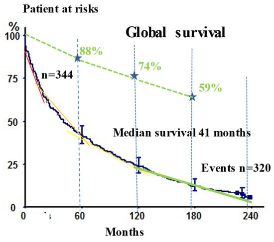 With respect to very long-term survival, the same cohort was used as in previous studies with a 5- to 7-year follow-up assessment [,,]. We updated data on later vital status by direct interrogation (in April 2021) of the French INSEE (Institut National de la Statistique et des Etudes Economiques) open-source national database (i.e., open-link Internet), which is already used for the assessment of lung cancer survival after surgical treatment by the French Epithor team []. The INSEE database is not exhaustive for foreign patients (even those having spent a long period in France), so among those patients born outside France, we considered as dead those stated as dead in the INSEE database, but we excluded the remaining cases from the study (n = 25).
