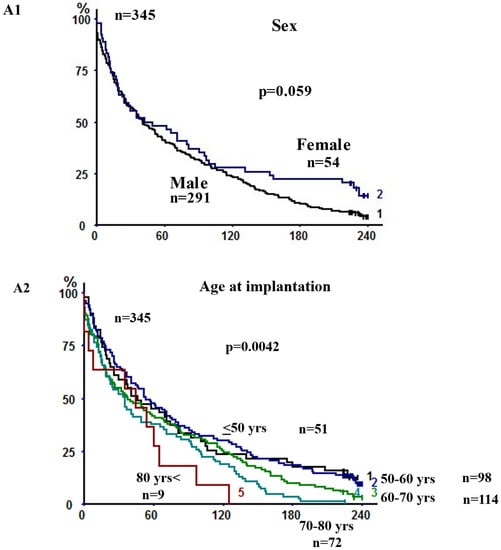 Table 2 shows the results of univariate survival analyses of 16 relevant clinical parameters. In our study at 20 years, increased age was strongly associated with poorer long-term survival (p = 0.0042) (Figure 2(A2)), while only a weak link with the sex of the patient (p = 0.059) was observed in this data set (Figure 2(A1)). With regard to tobacco consumption, neither smoking status at surgery (p = 0.24) nor smoking cessation before surgery (p = 0.39) impacted the outcome. At the same time, chronic bronchitis (p = 0.027) (Figure 2(E1)) and cumulative tobacco consumption (p = 0.021) (Figure S1(E5)) were associated with a poorer survival. By univariate analysis, the following were also not found to be significantly associated with very long-term survival: preoperative FEV1 in percentage of predicted value (FEV1%) (p = 0.82) (Supplemental Figure S1(E4)), the presence of COPD (p = 0.26) (Supplemental Figure S1(E2)) and its severity in terms of GOLD category (p = 0.94) (Supplemental Figure S3(E3)). Regarding additional comorbid illnesses, a weak association (not statistically significant) with outcome was observed for alcohol abuse (p = 0.062) (Supplemental Figure S3(E6)) but not diabetes mellitus (p = 0.31) (Supplemental Figure S1(E7)).