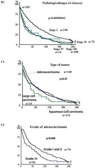 This study was conducted in a single institution with a low number of patients compared to nationwide databases. At the same time, survival for a period of more than 15 years has never been reported for NSCLC with or without surgery. The follow-up of national databases is limited to only 14 years for the longest observation time. One another important strength of the present study is that we collected prospectively a wide range of variables covering many patient characteristics. In our study cohort from a single institution (the thoracic department of a university hospital), survival was assessed at several earlier time points: 5 years [,], 6 years [,], and 7 years []. Most of the patients in the cohort were followed by our department and institution. Importantly, direct contact with patients or relatives enabled us to obtain true survival figures at each time point, including the 20-year point. Finally, compared with our study, the national databases have only investigated a few patient clinical characteristics, so important information on tobacco-related variables is generally missing [,,].