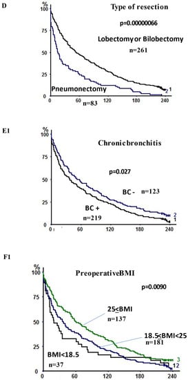 Like our findings for the stage of disease, most risk factors identified in our study as predictors of late survival have also been identified as affecting shorter term (5 or 10-year) survival rates, in particular: age [,], chronic bronchitis [], COPD [,] FEV1% [,,], smoking history [] or cumulative smoking [,,,,], nutritional status [], BMI [], weight loss [], and systemic inflammation.