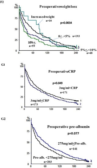 With respect to inflammation and nutritional parameters, body mass index (BMI) was significantly associated with outcome, with patients with the lowest BMI < 18.5 having the poorest outcomes, while patients with a higher BMI (25 ≤ BMI) being protected (p = 0.0090) (Figure 2(F1)). Similarly, the importance of weight loss in the last 6 months was also associated with a poorer outcome (p = 0.0034) (Figure 2(F2)). On the other hand, preoperative prealbumin ≥ 275 mg/mL (shown to influence survival up to 7 years [] in an independent manner) was also associated with a slight trend (non-significant) toward better survival (p = 0.065) (Figure 2(G2)). Interestingly, in this study, Preoperative C-reactive protein (CRP), which was shown to influence survival at 7 years in an independent manner [], remained a positive predictive factor at 20 years by univariate analysis (p = 0.049) (Figure 2(G1)).