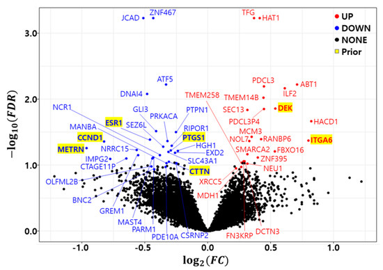 As previously discussed, the bootstrap t-test was repeated 10 times to minimize the randomness of the bootstrap procedure. A gene with a in at least one trial was called a differentially expressed gene (DEG). Figure 1 shows a volcano plot of the differentially expressed genes (DEGs) in the development dataset (GSE25066). We found 23 up regulated genes (HAT1, TFG, ABT1, PDCL3, ILF2, TMEM14B, DEK, PDCL3P4, SEC13, HACD1, MCM3, RANBP6, ITGA6, NOL7, FBXO16, SMARCA2, ZNF395, FN3KRP, DCTN3, TMEM258, NEU1, MDH1, and XRCC5) and 29 down regulated genes (JCAD, ZNF467, ATF5, DNAI4, GLI3, PTPN1, ESR1, PRKACA, CCND1, RIPOR1, SEZ6L, METRN, LRRC15, PTGS1, HGH1, SLC43A1, EXD2, GREM1, NCR1, PARM1, MAST4, CTAGE11P, IMPG2, CTTN, MANBA, CSRNP2, OLFML2B, PDE10A, and BNC2). Table 5 summarizes the differentially expressed genes (DEGs) in the development dataset. The column count indicates how many times a gene was called a DEG in the 10 trials. The Fold Change (FC) and False Discovery Rate (FDR) were averaged from 10 trials and placed in the FC and FDR columns of the table. The number of common genes between the prior marker gene and DEGs was only 7.