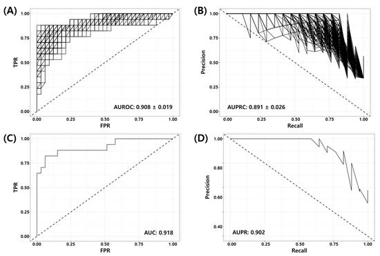 Random Forest Recursive Feature Elimination (RF-RFE) was used as described in Section 2.5 to derive the optimal combination of markers for the model training from 1124 genes obtained from the union of prior marker genes (1079 genes) and DEGs (52 genes). Here, we used 70% of the development dataset (GSE25066) as the training set (40 pCR vs. 80 RD) and 30% of the data as the test set (17 pCR vs. 33 RD). Figure 2 shows the Receiver Operating Characteristic (ROC) and Precision Recall (PR) curves of the RF-RFE optimized model for the test set. Figure 2A,B show the ROC and PR curves of all 1000 models. It can be seen in the figure that all trained models are working well for the test set (mean BACC = 0.848, AUROC = , AUPRC = ). Figure 2C,D show the ROC and PR curves of the best model consisting of 86 genes (See Supplementary Table S1). The AUROC and AUPRC of the best model were 0.918 and 0.902, respectively. Table 6 shows the binary classification performance metrics for the best model at the predefined threshold of the False Positive Rate (FPR, ). Here, positive indicates the desired outcome pCR, and negative indicates the undesired outcome RD.
