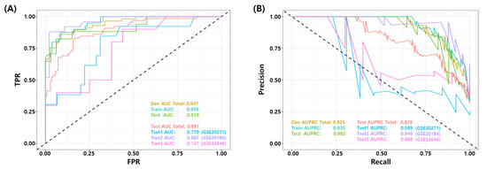 The final model was validated on three independent data sets (GSE20271, GSE20194, and GSE32646). Figure 3 show the ROC and PR curves of the final model. The test AUROC and AUPRC of the final model for all test samples were 0.891 and 0.829, respectively. The final model performed better on the GSE20194 dataset compared to the other two datasets (GSE20271 and GSE32646), achieving an AUROC 0.967 vs. 0.779 and 0.747, respectively. Table 6 summarizes the binary classification performance of the final model for all test datasets. The average performance for all samples was as follows: BACC 0.800, TPR 0.692, PPV 0.907, NPV 0.864, F1 score 0.732, MCC 0.619, and Yoden’s Index 0.600, respectively. Again, the performance metrics were calculated from a predefined false positive rate (FPR, ) threshold.