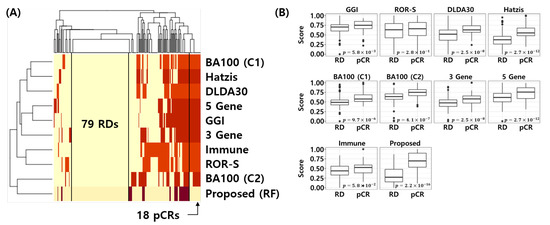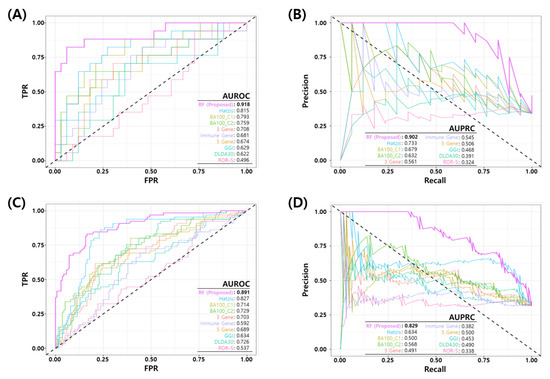 We performed comparative analysis of the proposed model with existing NAC response prediction models. We considered ROR-S [27], GGI [53], DLDA30 [23], Hatzis [18], BA100 [26], three-gene [19], five-gene [20], and Immune associated signatures [21] as comparable models for the NAC response prediction, as discussed earlier. To derive the ROR-S and GGI score, we used the ggi and rorS function in the genefu R package [63]. For the DLDA30 score, we reimplemented the DLDA30 score function available at the author’s web site (http://bioinformatics.mdanderson.org/pubdata.html, accessed on 15 November 2021). For the Hatzis model, we used adaptive LASSO based on the genes of the NAC response for ER-breast cancer patients proposed by the authors [18] because model coefficients and a training algorithm (TGDR) were not available. We newly implemented the BA100 [26], three-gene [19], five-gene [20], and immune associated signature [21] models as described in the original papers. Because the BA100 uses a two step classifier, we evaluated the performance of both classifiers separately. We compared the ROC and PR curves, confusion matrices with prespecified FPR and performance metrics of the binary classification.