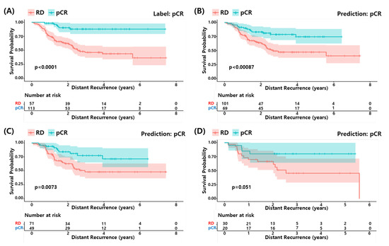 Survival analysis of proposed model. (A) pCR label and (B) pCR prediction by proposed model in development dataset. (C) pCR prediction in the train set and (D) pCR prediction in the test set.