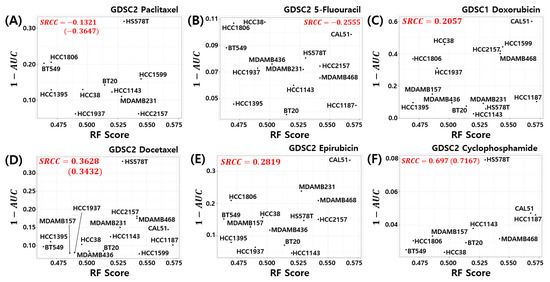 Visualization of pCR scores of the proposed model and chemosensitivity of TNBC cell lines. Six drugs used to treat T/FAC or T/FEC were investigated: (A) Paclitaxel, (B) 5-FU, (C) Doxorubicin, (D) Docetaxel, (E) Epirubicin, and (F) Cyclophosphamide.