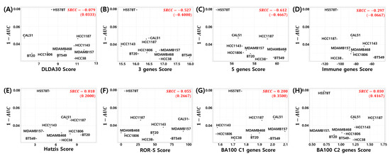 Visualization of pCR score of the seven published models vs. Cyclophosphamide sensitivity in TNBC cell lines: (A) DLDA30, (B) 3 genes, (C) 5 genes, (D) Immune genes, (E) Hatzis, (F) ROR-S, (G) BA100 Classifier 1, and (H) BA100 Classifier 2. SRCC values in parentheses exclude HS578T data point.