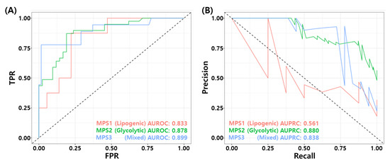 Recently, Gong et al. proposed metabolic-pathway based subtyping (MPS) of triple negative breast cancer to reveal potential therapeutic targets [76]. We stratified our test samples based on the MPS signatures suggested by Gong et al., and evaluate MPS specific performance of the proposed model. We performed GSVA for these MPS genesets on our test datasets. Among 205 samples, 44 samples were classified as MPS1, 81 samples were classified as MPS2, and 80 samples were classified as MPS3. MPS1 and MPS3 samples consist mostly of RD patients. In particular, 81% of MPS1 samples (36/42), and 77.5% of MPS3 samples are RD patients. MPS2 subtype contains 48% of pCR patients (39/81). Figure 9A,B shows the ROC and PR curves for MPS specific prediction by the proposed RF model. The proposed model showed relatively high performance in MPS2 and MPS3 subtypes compared to MPS1 subtype. Table 9 shows the binary classification performance of the proposed model for each MPS subtypes. The BACC of MPS1, MPS2, and MPS3 were 0.646, 0.747, and 0.841, respectively. These results may imply that the TNBC patients who have MPS 2 subtype can have higher probability of pCR with T/FAC or T/FEC based NAC.