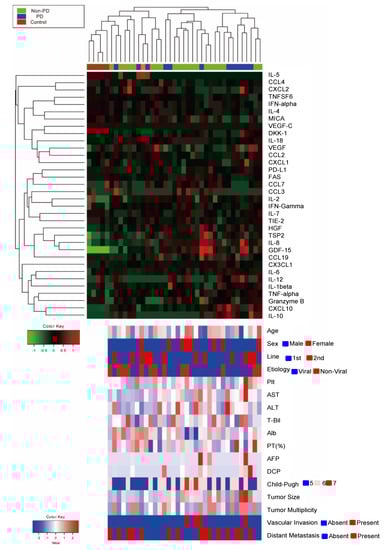 Heatmap of 34 plasma proteins quantified by a multiplex bead-based immunoassay using the baseline plasma of 34 HCC patients treated with Atezo/Bev therapy and 5 healthy controls. The upper heatmap shows each protein level, and the bottom heatmap shows patient backgrounds. IL-5, interleukin-5; CCL4, CC motif chemokine 4; CXCL2, C-X-C motif ligand 2; TNFSF6, tumor necrosis factor superfamily 6; IFN-alpha, interferon-alpha; IL-4, interleukin-4; MICA, MHC class I polypeptide-related sequence A; VEGF-C, vascular endothelial growth factor-C; DKK-1, dickkopf related protein-1; IL-18, interleukin-18; VEGF, vascular endothelial growth factor; CCL2, CC motif chemokine 2; CXCL1: C-X-C motif ligand 1; PD-L1, programmed death-ligand 1; CCL7: CC motif chemokine 7; CCL3, CC motif chemokine 3; IL-2: interleukin-2; IFN-Gamma: interferon-gamma; IL-7, interleukin-7; HGF, hepatocyte growth factor; TSP2, thrombospondin 2; IL-8, interleukin-8; GDF-15, growth/differentiation factor-15; CCL19, CC motif chemokine 19; CX3CL1, C-X3-C motif chemokine ligand 1; IL-6, interleukin-6; IL-12: interleukin-12; IL-1beta, interleukin-1 beta; TNF-alpha, tumor necrosis factor-alpha; CXCL10, C-X-C motif ligand 10; IL-10, interleukin-10; Plt, platelet cell count; AST, aspartate aminotransferase; ALT, alanine aminotransferase; T-Bil, total bilirubin; Alb, albumin; PT, prothrombin time; AFP, alpha fetoprotein; DCP, Des-gamma-carboxy-prothrombin; PD, progressive disease; non-PD, non-progressive disease including complete response, partial response, and stable disease.
