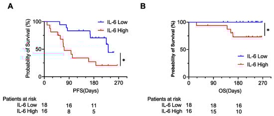 The Kaplan–Meier curve for the progression-free survival (PFS) (A) and overall survival (OS) (B). The patients were divided into 2 groups by the median value of plasma IL-6. * p < 0.05.
