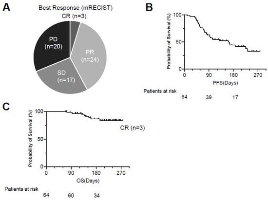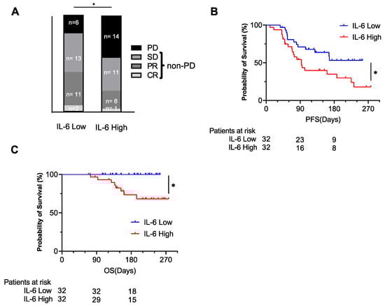 The ORR and DCR were 40.6% and 81.3% in the IL-6-low group (CR/PR/SD/PD: 2/11/13/6) and 21.9% and 56.3% in the IL-6-high group (CR/PR/SD/PD: 1/6/11/14), respectively (Figure 4A). The PD ratio at the initial evaluation was significantly higher in the IL-6-high group compared to the IL-6-low group (Figure 4A). The PFS and OS of the IL-6-high group were significantly shorter than those of the IL-6-low group (Figure 4B,C).