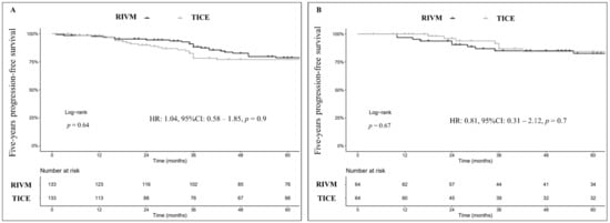Kaplan–Meier curves (Log-rank) depicting the effect of BCG strains (TICE vs. RIVM) on 5-years progression-free survival (PFS) in the whole study cohort after 1:1 PSM (n = 266) (A) and in the sole sub-group of patients who had secondary resection (re-TUR) followed by BCG induction plus maintenance after 1:1 PSM (n = 128) (B).