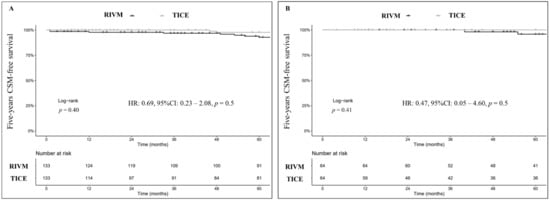 After 1:1 PSM, Five-year CSS was 98% (95% CI: 95–99%) for TICE and 93% (95% CI: 88–98%) for RIVM (Log-rank, p = 0.4; Figure 3A). Similarly, to PFS, none of the two strains was independently associated with improved CSS both at whole cohort and sub-group analysis level (HR: 0.69, 95% CI: 0.23–2.08, p = 0.5; HR: 0.47, 95% CI: 0.05–4.60, p = 0.5, respectively; Figure 3B).