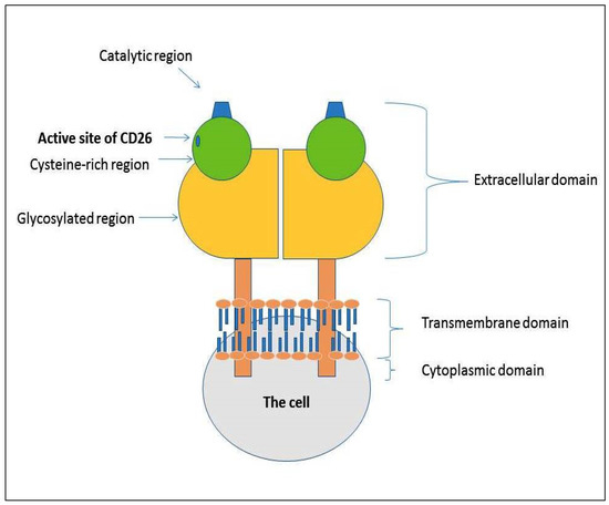 CD26/Dipeptidylpeptidase IV (DPP-4) is a 110 KDa type II glycoprotein. It is expressed both in soluble form in body fluids and as membrane-bound on the cell surface of several cells and tissues, particularly in the kidney, small intestine, endothelial, epithelial cells, and immune system cells [1]. CD26 is a multifunctional protein involved in numerous mechanisms, such as apoptosis, interaction with other proteins, hematopoiesis, and cancer progression [2,3]. The CD26 protein structure consists of two subunits containing three domains: a catalytic region, a transmembrane region, and a large extracellular region (Figure 1). The activity of CD26 can occur through two different manners: an enzymatic-dependent way or an enzymatic-independent action. In the first condition, CD26 digests and inactivates polypeptides, chemokines, and peptide hormones, such as the glucagon-like peptide or glucose-dependent insulinotropic peptide, whereas, for non-enzymatic action, it interacts with adenosine deaminase (ADA), caveolin-1 and other extracellular matrix (ECM) proteins.