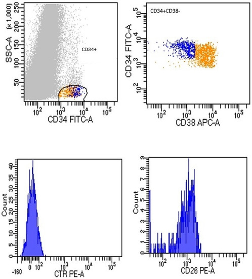 Flow cytometry CD26 expression on PB sample of CML at diagnosis. After a selection of cellular compartment CD34+/CD38− (upper boxes), the fraction CD26+ was selected within them (boxes on down, represented as histograms). Acquisition of at least 1 × 106 cells was performed by using FACSCanto II flow cytometry instrument (BD, Biosciences, San Jose, CA, USA).