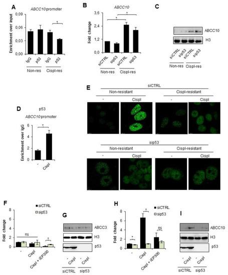 p53 recruits EP300 to chromatin upon exposure of non-resistant A549 cell to cisplatin and controls ABCC10 direct response to the alkylating agent. (A) Enrichment of p53 at the promoter of ABCC10 in unstimulated non- and cisplatin-resistant lung cancer cells was analyzed with ChIP-qPCR. (B,C) Transient silencing of p53 was utilized to assess the possible impact of this protein on ABCC10 expression in two phenotypes of unstimulated A549 cells. (B) mRNA was quantified 48 h after cell transfection with siRNA by TaqMan-based real-time PCR, normalized to ACTB, GAPDH, and TBP and is shown as fold-change versus siCTRL transfected cells. (C) Protein level was compared between siCTRL and sip53 by Western blot 72 h after cell transfection. Histone H3 was used as an internal control. (D) Recruitment of p53 to the promoter of ABCC10 in cells treated with cisplatin (10 µM) for 24 h was analyzed by ChIP-qPCR. (E) The role of p53 in EP300 enrichment at chromatin was visualized by immunocytostaining followed by confocal microscopy. Cells were exposed to cisplatin (10 µM) 48 h after cell transfection with siRNA, and EP300 was stained with rabbit antibody 24 h after cell treatment with anticancer drugs. Green fluorescence of Alexaflor488-conjugated secondary antibody marks chromatin-bound acetyltransferase. (F–I) Impact of p53 on expression of ABCC3 (F,G) and ABCC10 (H,I) was evaluated by comparing gene expression in cisplatin-induced non-resistant A549 cells transfected with siCTRL and sip53. mRNA (F,H) was isolated and quantified by TaqMan-based real-time PCR and protein (G,I) by Western blot 24 h after administration of the chemotherapeutic (10 µM). After normalization to housekeeping controls, mRNA level in siCTRL untreated cells was assumed as 1. In Western blot, histone H3 was used as loading control. (A,B,D,F,H) All bars represent the mean of replicates ± SEM. (A,F,H) The enrichment of p53 at the ABCC10 promoter and the effect of cisplatin and iEP300 on ABCC3 and ABCC10 gene expression in cells that differ in p53 level were analyzed with t test. (B) The effect of sip53 silencing on ABCC10 expression in non-resistant and cisplatin resistant A549 was evaluated with Kruskal–Wallis test and Dunn’s multiple comparison test. (D) The enrichment of p53 at ABCC10 promoter upon cisplatin treatment was analyzed with the Mann–Whitney test. Statistically significant differences between analyzed groups were marked with * when p < 0.05. Detailed statistical analysis can be found in Table S1. Densitometry result of Western blot images is available in Table S2. Original WB can be found at Figure S1.