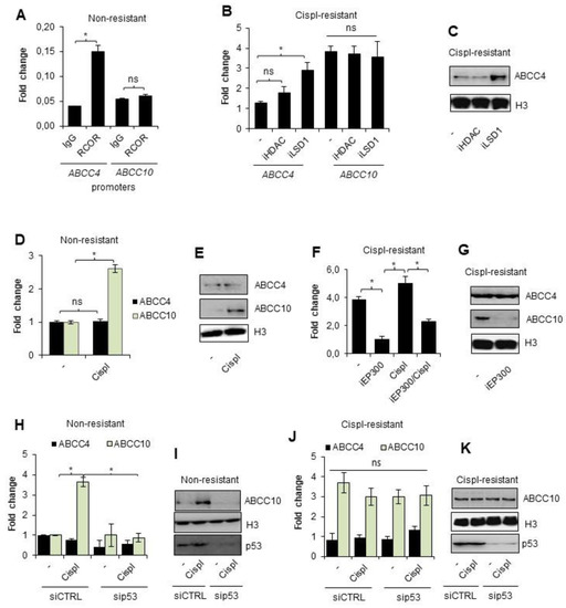 These premises prompted us to test the possible molecular link between CoREST complex occurrence at the promoters of the ABCC gene subfamily of ABC transporters and their overexpression in cisplatin-resistant cancer cells. For this purpose, we generated two cisplatin-resistant cell lines derived from non-small cell lung cancer cells (A549) and triple-negative breast cancer cells (MDA-MB-231), where cisplatin is considered in mono- or combined neo- or adjuvant chemotherapy. Furthermore, we compared the interaction of EP300 and p53 with CoREST-bound and -free ABCC gene promoters with their responsiveness to cisplatin.