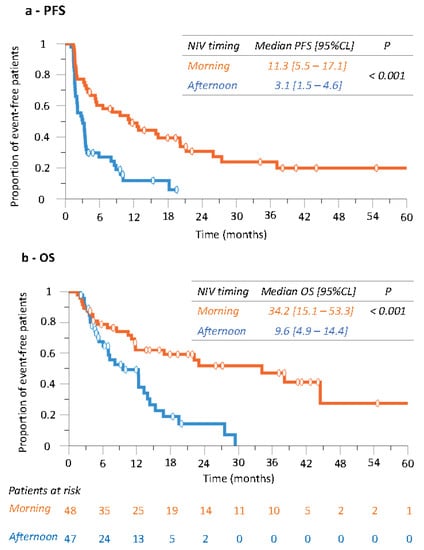 In the 95 patients, median PFS and OS (95% CL) were 3.9 months (2.1–5.8) and 14.0 months (9.5–18.4), respectively. Strikingly, median PFS and median OS were both nearly four times as long following ‘morning’ rather than ‘afternoon’ nivolumab dosing (Figure 2). Median PFS varied from 11.3 months (5.5–17.1) for the ‘morning’ group down to 3.1 months (1.5–4.6) for the ‘afternoon’ group (p < 0.001) (Figure 2a). Corresponding median OS values were 34.2 months (15.1–53.3) and 9.6 months (4.9–14.4), respectively (p < 0.001 (Figure 2b).