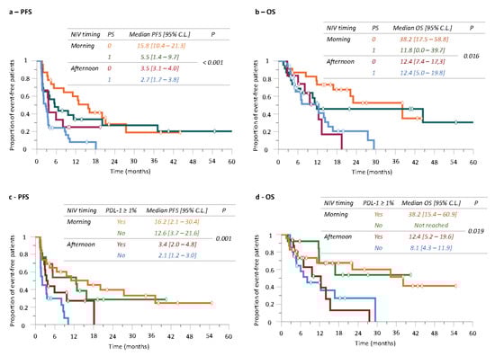 Median PFS was significantly longer in the 35 patients with a PS of 0 (11.1 months (2.2–20.0)) as compared to that in the 56 patients with PS = 1 (3.3 months (2.4–4.2)) (p = 0.020). A similar trend was found for OS according to PS, although non-significantly so (PS = 0: 19.5 months (8.2–30.8); PS = 1: 11.8 months (9.4–14.2); p = 0.13). Notwithstanding, ‘morning’ nivolumab significantly improved both PFS and OS in each PS category in comparison with ‘afternoon’ administration (Figure 4a,b).