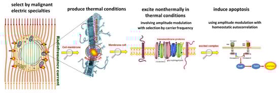 - The appropriate frequency is selected around 10 MHz [94]. When the frequency is larger (>15 MHz), the membrane impedance becomes too small to select the disordered TME accurately. The current will flow through the entire target tissue almost homogeneously, neglecting the selection heterogenic selection factors of malignant cells. When the carrier frequency does not ensure selection, the modulation also activates the healthy cells. The significantly larger amount of membrane rafts between healthy and malignant cells [106] remain selective factors only.