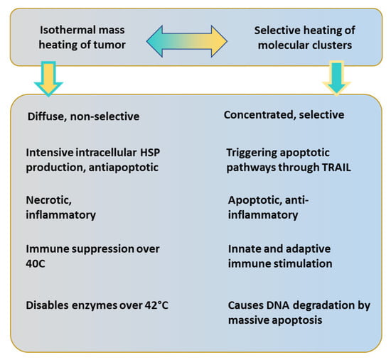 - The thermal effect happens in nanoscopic local “points”, the rafts. These NPs are molecular clusters and sensitive to overheating. When the absorbed energy is too large, it destroys the rafts by overheating. The mEHT loses its most significant advantage, the excitation of signal-transports for apoptosis and immunogenic cell death (ICD).