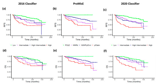 Relapse-free survival (RFS) and overall survival (OS) curves estimation by stratification prognosis tools. Upper row illustrates RFS for the 2016 Classifier (a), ProMisE (b), and 2020 Classifier (c). Lower row illustrates OS for the 2016 Classifier (d), ProMisE (e), and 2020 Classifier (f). The 2016 Classifier refers to the ESMO-ESGO-ESTRO classification, ProMisE to the Proactive Molecular Risk Classifier for Endometrial Cancer, and the 2020 Classifier to ESGO-ESTRO-ESP.