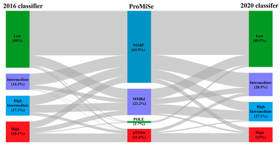 Lastly, regarding the 2020 Classifier, the low-risk group was the most frequent, with a similar proportion as that of the 2016 Classifier. However, there was a redistribution of the other three groups, with a decrease in the percentage of high-risk cases, and a redistribution of the intermediate and high-intermediate risk groups. Figure 2 illustrates shifts between the three stratification systems analysed.