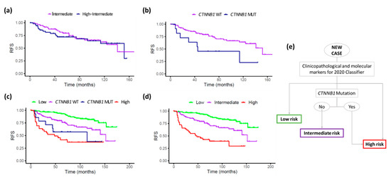 KM relapse-free survival plots for the new risk stratification proposal. (a) Intermediate and high-intermediate groups following the 2020 Classifier criteria; (b) merged intermediate groups stratified by CTNNB1 status; (c) entire series, including high and low-risk groups based on 2020 Classifier criteria and intermediate groups stratified by CTNNB1 status; and (d) entire series with the new proposal, stratified in 3 groups, by adding those with CTNNB1 mutation to the high-risk group. (e) Decision tree based on this proposal.