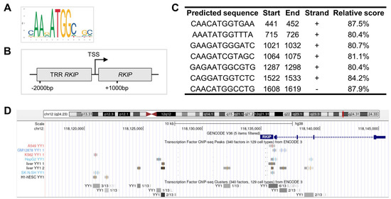The YY1 TF binds the RKIP gene regulatory regions. (A) JASPAR prediction matrix of YY1 TF DNA binding sequence. (B) Schematic of RKIP transcription regulatory region (TRR) and the gene. JASPAR analysis was performed between −2000 bp and +1000 bp around the Transcription Starting Site (TSS) of the RKIP gene. (C) JASPAR-predicted binding sites of YY1 within the RKIP gene regulatory region with location, strand and relative binding score (with 80% cutoff). (D) ENCODE 3 YY1-ChIP-Seq-deposited experiments revealed nine YY1-binding clusters, for a total of 23 YY1-binding peaks within eight different experiments (normal and tumor human cells). The genomic region analyzed ranges from 15,000 bp upwards to 5000 bp downwards the TSS of the RKIP gene.