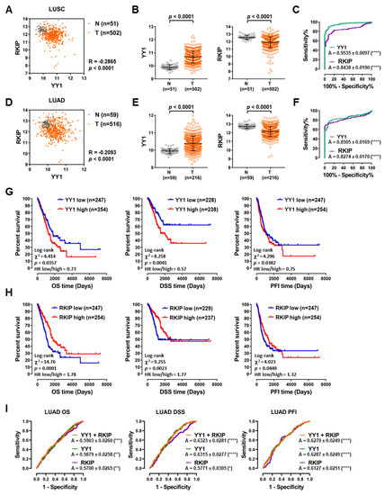 To study the predictive significance of both YY1 and RKIP in LC, two LC TCGA datasets were analyzed: LUSC and LUAD, both including tumor samples and matching normal lung samples. The Pearson’s correlation analysis demonstrated that YY1 and RKIP gene expressions showed a very significant and negative correlation in both LUSC and LUAD samples (−0.2865 and −0.2093, respectively, both with p < 0.0001; Figure 2A,D).