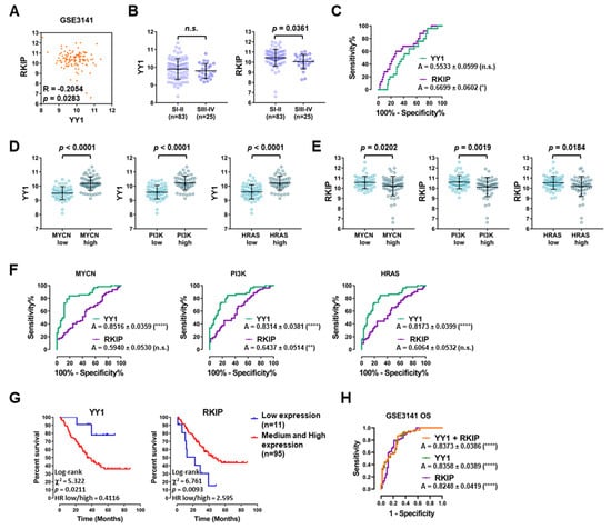 YY1 and RKIP are negatively correlated and show a diagnostic and prognostic value in NSCLC GSE3141 Dataset. (A) Pearson’s correlation analysis of YY1 and RKIP gene expression (n = 114). (B) YY1 and RKIP expression in low stage (Stage I, SI and Stage II, SII) versus high stage (Stage III, SIII and Stage IV, SIV) specimens. (C) ROC analysis of YY1 (green) and RKIP (purple) in NSCLC samples stratified based on cancer stage. (D) YY1 gene expression in patients stratified based on signature oncogenes expression levels (MYCN (left), PI3K (middle), HRAS (right)). (E) RKIP expression in patients stratified based on signature genes expression levels (MYCN (left), PI3K (middle), HRAS (right)). (F) ROC analysis of YY1 (green) and RKIP (purple) in NSCLC samples stratified based on MYCN (left), PI3K (middle), HRAS (right) gene expression level. (G) Survival analysis when patients are stratified in function of their OS in relation to YY1 (left) and RKIP (right) expression (90 percentile value is considered the cutoff). (H) Time-dependent ROC analysis and relative A for YY1 (green), RKIP (purple) and YY1 plus RKIP (orange), in correlation with OS. * p < 0.05; ** p < 0.01; **** p < 0.0001.