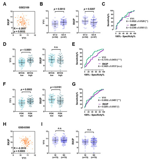 The GSE2019 NSCLC samples were further stratified based on their molecular signatures for the expression of two driver oncogenes: MYCN and PI3K (each divided into low and high expression sample groups). Interestingly, YY1 was significantly upregulated in samples expressing high levels of MYCN, as well as PI3K, whereas RKIP was downregulated with the higher expression of PI3K, and not MYCN (Figure 4D,F). The ROC curve analyses reported in Figure 4E,G further demonstrated that the AUC performance was high and significant for YY1, with values of 0.7319 and 0.6802 for MYCN and PI3K, respectively. Meanwhile, for RKIP the AUC was significant only in correlation with PI3K expression levels (with a value of 0.6285).