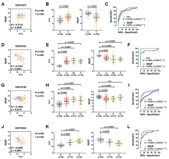 Finally, for the GSE18842 dataset, made of 46 T samples and 45 N matching samples showed a negative Pearson’s correlation between YY1 and RKIP gene expressions (−0.4268 with p < 0.0001; Figure 5J). In agreement with the above-described datasets, when T samples were stratified based on their type in A and S, both T subtypes showed a higher and significant expression of YY1 compared to matching N whereas RKIP expression was significantly lower. Consistently, the ROC curve analysis demonstrated the diagnostic significance of YY1 and RKIP gene expression levels in this dataset as well, with AUC of 0.9285 and 0.8437, respectively (both with p < 0.0001; Figure 5L).