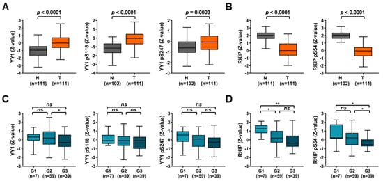 To further corroborate the gene expression results, a protein database was analyzed. Specifically, an NSCLC database of 111 T samples and 111 matching N samples (108 for the phosphorylation analysis). Intriguingly, YY1 total protein, as well as phospho-YY1 forms, p-Serine118 (pS118) and p-Serine247 (pS247), showed a significantly higher expression in T samples compare to N ones (Figure 6A). In contrast, both total RKIP and p-serine54 (pS54) were significantly lower in T samples compared to N ones (Figure 6B). In particular, when T samples were grouped based on their grade (G), only RKIP and pS54-RKIP levels were significantly reduced in higher grade samples (G2 and G3) compared to G1, while the results for YY1 were found not significant (Figure 6C,D). Although this result might be proven in additional larger cohorts, it confirmed that the higher levels of YY1 and the lower levels RKIP protein in T samples compared to matching N samples reflected what it was observed at the gene levels. Consequently, YY1 and RKIP protein detection, total and phosphorylated, might also possess diagnostic value.