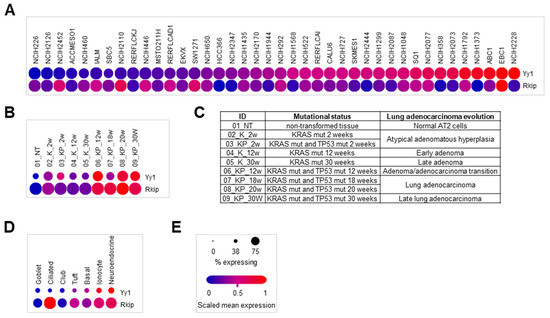 Single cell RNA-sequencing analyses of deposited datasets mouse and human lung cancer and normal tissues reveal an heterogenous and cell-specific expression of YY1 and RKIP. (A) SCP542 (53,513 cells). Single cells deriving from 40 different standard human LC cell lines. Analysis of YY1 and RKIP relative gene expression. (B) GSE152607, expression profiling of Yy1 and Rkip by high throughput sequencing in single cells (3891 cells) from mouse adenocarcinoma cells evolved through seven sequential stages. (C) Summary of the features of each single cellular group in terms of cancer stage. (D) GSE103354, expression profiling of Yy1 and Rkip by high throughput sequencing in single cells (7193 cells) of mouse airway epithelial cells. (E) Single cell profiling expression legend.