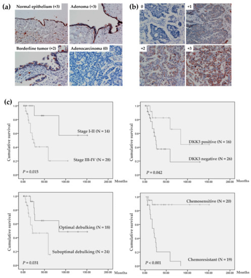 Survival was estimated using Kaplan–Meier estimates and compared using the log-rank test. Median counts were analyzed using the Mann–Whitney U-test. Kruskal–Wallis test was used to compare DKK3 expression among normal, benign, borderline, and invasive tumors. Dichotomous groupings were analyzed using the Chi-square and Fisher’s exact test as appropriate. Multivariate analysis was performed using the Cox regression method. The Mann–Whitney U-test was used to compare values between two groups. Cell viability was compared between two groups using the Mann–Whitney U-test with Bonferroni correction. All p-values reported are two-sided, and statistical significance was defined as p < 0.05. Statistical analysis was performed using the Statistical Package for the Social Sciences (SPSS, version 15.0, Chicago, IL, USA).