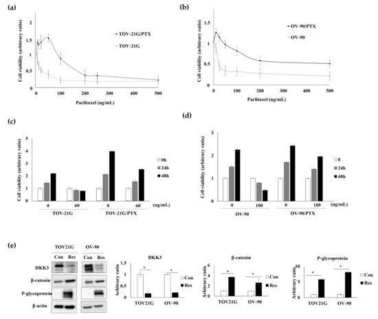 Characteristics of paclitaxel-resistant cells. (a,b) Cells were seeded in triplicates in 96-well plates in 0.1 mL culture medium at a density of 1 × 104 cells/well. After 24 h, the cells were treated with paclitaxel. MTT assay performed 48 h after treatment showed that the paclitaxel-resistant cells (TOV-21G/PTX and OV-90/PTX) had higher IC50 than the parental cells. (c,d) Paclitaxel treatment reduced the viability of parental cells, while the paclitaxel-resistant cells continued to grow. (e) Western blot analysis revealed that DKK3 was lost and that β-catenin and P-glycoprotein were upregulated in paclitaxel-resistant cells (Res) compared to that in their parent cells (Con). β-Actin was used as the loading control. * p < 0.01.
