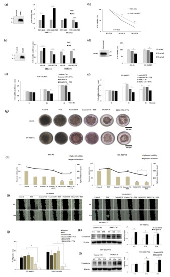 DKK3 is a well-known secreted protein [31]. Therefore, we treated the cells with conditioned media containing secreted DKK3, which was produced by DKK3-overexpressing 293 cells. The media of empty vector-transfected cells was used as the control media. The proliferation of TOV-21G and TOV-21G/PTX was inhibited by treatment with DKK3-conditioned media in a dose-dependent manner, while the cells grew well in the control media (Figure 3a,b). The viability of OV-90 cells increased in the control media but decreased in the -conditioned media, while OV-90/PTX cells were inhibited by both the conditioned media, with the inhibitory effect of the DKK3-conditioned media being stronger than that of the control media (Figure 3c). Next, we tested the effect of purified recombinant human DKK3 protein in OV-90 and OV-90/PTX cells and found a dose-dependent inhibition in both cell lines (Figure 3d). We further assessed whether secreted DKK3 increased the anti-tumoral effect of paclitaxel in paclitaxel-resistant cells. Cotreatment with paclitaxel and control conditioned media did not interrupt the growth of TOV-21G/PTX and OV-90/PTX cells; however, cotreatment with paclitaxel and DKK3-conditioned media significantly decreased the viability of both paclitaxel-resistant cell lines (Figure 3e,f), suggesting synergism between the effects of DKK3 and paclitaxel. Next, the anti-proliferative effect of DKK3 was evaluated in three-dimensional (3D) tumor spheroids of OV-90 and OV-90/PTX formed in the microwell arrays (Figure 3g,h). We observed that DKK3 CM treatment shrunk the spheroids and that cotreatment with DKK3 CM and paclitaxel disassembled them, indicative of serious damage. We compared the diameter of the spheroids to evaluate the effect of the treatments on spheroid growth, as the clinical response of cancer treatment was previously evaluated by measuring tumor diameter [32]. Simultaneously, we assessed cellular viability using the MTT assay after suspension of spheroids into single cells. The size and viability of spheroids in the DKK3 conditioned medium were significantly lower than those in the control conditioned medium. Moreover, cotreatment of OV-90/PTX with secreted DKK3 and paclitaxel synergistically reduced spheroid size despite no difference in cell viability. Next, the anti-tumoral effect of DKK3 on OV-90/PTX and TOV-21G/PTX was evaluated using migration assay (Figure 3i,j). Cell migration in DKK3 CM was remarkably inhibited compared to that in the control CM, and cotreatment with DKK3 CM and paclitaxel synergistically reduced cell motility. Furthermore, to understand the underlying mechanism, we assessed the expression of E-cadherin, an epithelial marker. Loss of E-cadherin expression reflects cancer metastasis [33]. Our results showed that E-cadherin was upregulated in the DKK3 CM group compared to that in the control CM group, indicating that DKK3 inhibits ovarian cancer cell migration by restoring epithelial–mesenchymal transition (Figure 3k,l and Figure S2). Therefore, secreted DKK3 exerted an anti-tumoral effect in paclitaxel-resistant ovarian cancer cells and enhanced paclitaxel susceptibility.