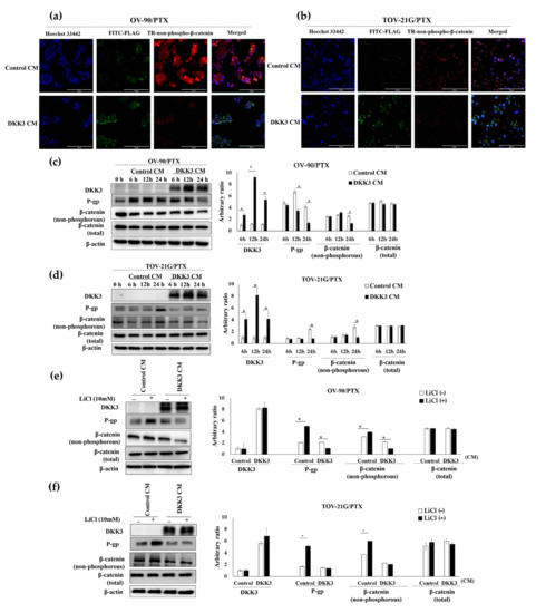 Secreted DKK3 enhanced paclitaxel susceptibility via inhibition of the β-catenin-P-glycoprotein signaling pathway. (a,b) The cells were incubated with control and DKK3 CM. Immunofluorescence analysis after 24 h showed that FLAG-DKK3 was present in the perinuclear area, attenuating TR-non-phospho-β-catenin signaling. Scale bar, 50 μm. (c,d) The cells were incubated with control and DKK3 CM and subjected to Western blotting. The graphs were plotted based on the band densities (* p < 0.01). (e,f) To activate endogenous β-catenin, cells were treated with LiCl for 24 h and subjected to Western blot analysis. β-Actin was used as the loading control. The intensities of the Western blot bands were normalized to that of β-actin for comparison (* p < 0.01).