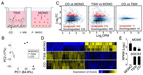 BMSC-induced transcriptome signatures of MM cells. (A) The co-culture model of MM cells with BMSCs using a transwell. TSW: MM cells in the upper transwell; CO: MM cells from the lower chamber where adhesive BMSCs coexisted; MONO: MM cells in monoculture. (B) PCA applied to samples from MONO, TSW, and CO based on gene expression values. (C) MA-plots displaying Log2CPM (X-axis) and fold change of expression (y-axis) for the comparisons of CO vs. MONO (left), TSW vs. MONO (middle), and CO vs. TSW (right). Red: Genes upregulated in expression. Black: Genes downregulated. Blue: All expressed genes. (D) Heat map visualization of expression level for genes (columns) differentially expressed between any two from MONO, TSW, and CO. Expression values were normalized into z-scores for each gene across all samples. (E) Comparisons of gene expression level (RPKM; log2) across MONO, TSW, and CO for MCM5 and SOCS3. Error bar: Standard deviation.