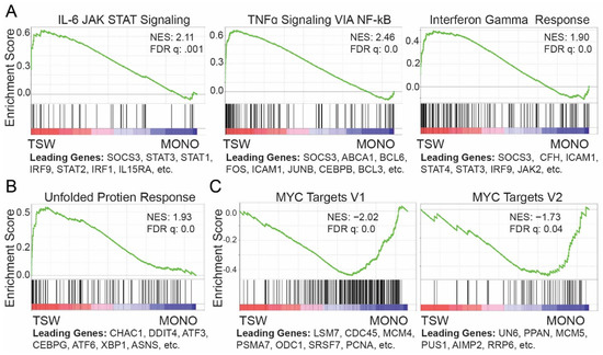 BMSCs affected the expression of several MSigDB hallmark gene sets in MM cells. (A–C) GSEA of expressed genes sorted by fold change of expression (TSW/MONO) from high (red) to low (blue) against MSigDB hallmark gene set (vertical bars): IL6/JAK/STAT signaling (A, left), TNFα signaling via NFκB (A, middle), INFγ response (A, right), unfolded protein response (B), MYC targets V1 (C, left), and MYC targets V2 (C, right).