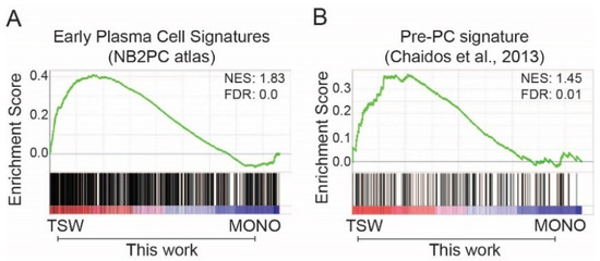 BMSC-coculture recapitulated gene signatures of early B cells in MM. (A,B) GSEA of expressed genes sorted by fold change of expression (TSW/MONO) from high (red) to low (blue) against signature genes (vertical bars) of early plasma cells from the NB2PC atlas (A) or signature genes of Pre-PC from newly diagnosed (ND) MM patients (B), see [26].