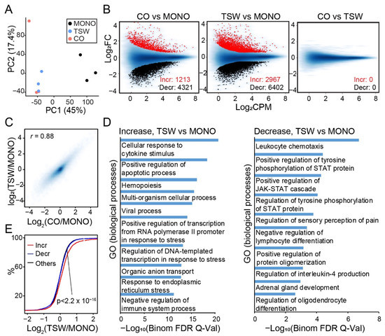 BMSCs induced substantial transformation of regulome in MM. (A) PCA applied to samples from MONO, TSW, and CO based on chromatin accessibility at reference accessible regions (peaks) defined by Omni-ATAC. (B) MA-plots displaying Log2CPM (X-axis) and fold change of chromatin accessibility (Y-axis) for the comparisons of CO vs. MONO (left), TSW vs. MONO (middle), and CO vs. TSW (right). Red: Reference peaks increasing in accessibility (Incr); Red: Reference peaks decreasing in accessibility (Decr); blue: All reference peaks. (C) Smoothed scatter plot comparing the fold changes in accessibility at reference peaks between CO vs. MONO and TSW vs. MONO. r: Pearson correlation coefficient. (D) Top ten enriched gene ontology (GO) terms on biological processes for GREAT-predicted target genes of reference peaks that increased (left panel) or decreased (right panel) in accessibility from MONO to TSW. (E) Empirical cumulative distribution of the fold change of expression (TSW/MONO) of target genes predicted for peaks showing increase (Incr), decrease (Decr), or no change (Others) in accessibility from MONO to TSW. A line shifting to the right indicates an overall increase in the fold change of expression. p-value by the Kolmogorov–Smirnov (K-S) test.