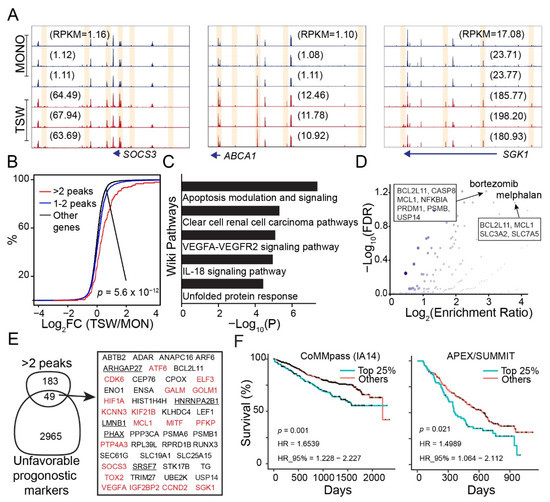 Genes with multiple peaks that increased in chromatin accessibility as induced by BMSCs are clinically relevant to MM. (A) Omni-ATAC read distribution around the genes SOCS3 (left), ABCA1 (middle), and SGK1 (right) across MM samples from the monoculture (MONO) and the upper transwell (TSW). Y-axis (normalized read density) adjusted to the same scale within each plot. Highlighted in yellow: Peaks increasing in accessibility from MONO to TSW; numbers in parenthesis: Gene expression values in RPKM (decimal). (B) Empirical cumulative distribution of the fold change of expression (TSW/MONO) of genes associated with 1–2 peaks or multiple peaks (>2) that increased in accessibility from MONO to TSW. p-value by the K-S test. (C) Gene pathways enriched for the genes associated with multiple peaks as in panel (B). (D) Drug-based enrichment analysis based on the GLAD4U database [39] for the genes associated with multiple peaks as in panel (B). Y-axis: The significance of overlapping by FDR. X-axis: Enrichment ratio (observed number/expected number); blue color with intensity proportional to the number of overlapped genes. (E) Venn diagram for genes associated with multiple peaks as in panel (B) and unfavorable prognostic markers in overall survival as defined from several MM patient cohorts (see Section 2). Red: Expression upregulated in TSW vs. MONO (FDR < 0.1). Underlined: Expression downregulated in TSW vs. MONO (FDR < 0.1). (F) Kaplan–Meier survival plot for MCL1 from the CoMMpass trial (left) or the APEX/SUMMIT trial (right). Patients sorted into the top 25% and others based on MCL1 expression. p-value by log-rank test.