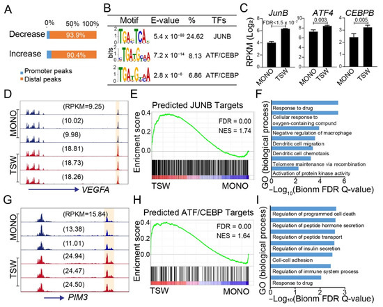 TFs predicted to regulate BMSC-induced transformation of regulome. (A) Distribution of differential peaks in promoter regions and distal non-promoter regions grouped by their changes from monoculture (MONO) to the upper transwell (TSW). (B) Top motifs discovered by MEME for peaks increasing in accessibility from MONO to TSW, with E-value, % of peaks containing the motif, and representative TFs indicated. (C) Comparisons of gene expression level (RPKM; log2) between MONO and TSW for JUNB, ATF4, and CEBPB. Error bar: Standard deviation. FDR calculated by EdgeR. (D) Omni-ATAC read distribution around VEGFA across MM samples from MONO and TSW. Y-axis (normalized read density) adjusted to the same scale. Highlighted in yellow: Peaks containing JUNB motif; numbers in parenthesis: Gene expression level in RPKM (decimal). (E) GSEA of expressed genes sorted by fold change of expression (TSW/MONO) from high (red) to low (blue) against genes (vertical bars) predicted as targets of peaks that increased accessibility and contained JUNB motif(s). (F) Biological processes enriched with predicted JUNB targets as in panel (E). (G) Similar to panel (D) but for PIM3; highlighted in yellow: Peaks containing ATF::CEBP motif (H) Similar to panel (E) but for targets of peaks that increased accessibility and contained ATF::CEBP motif(s). (I) Biological processes enriched for predicted ATF::CEBP targets as in panel (H).